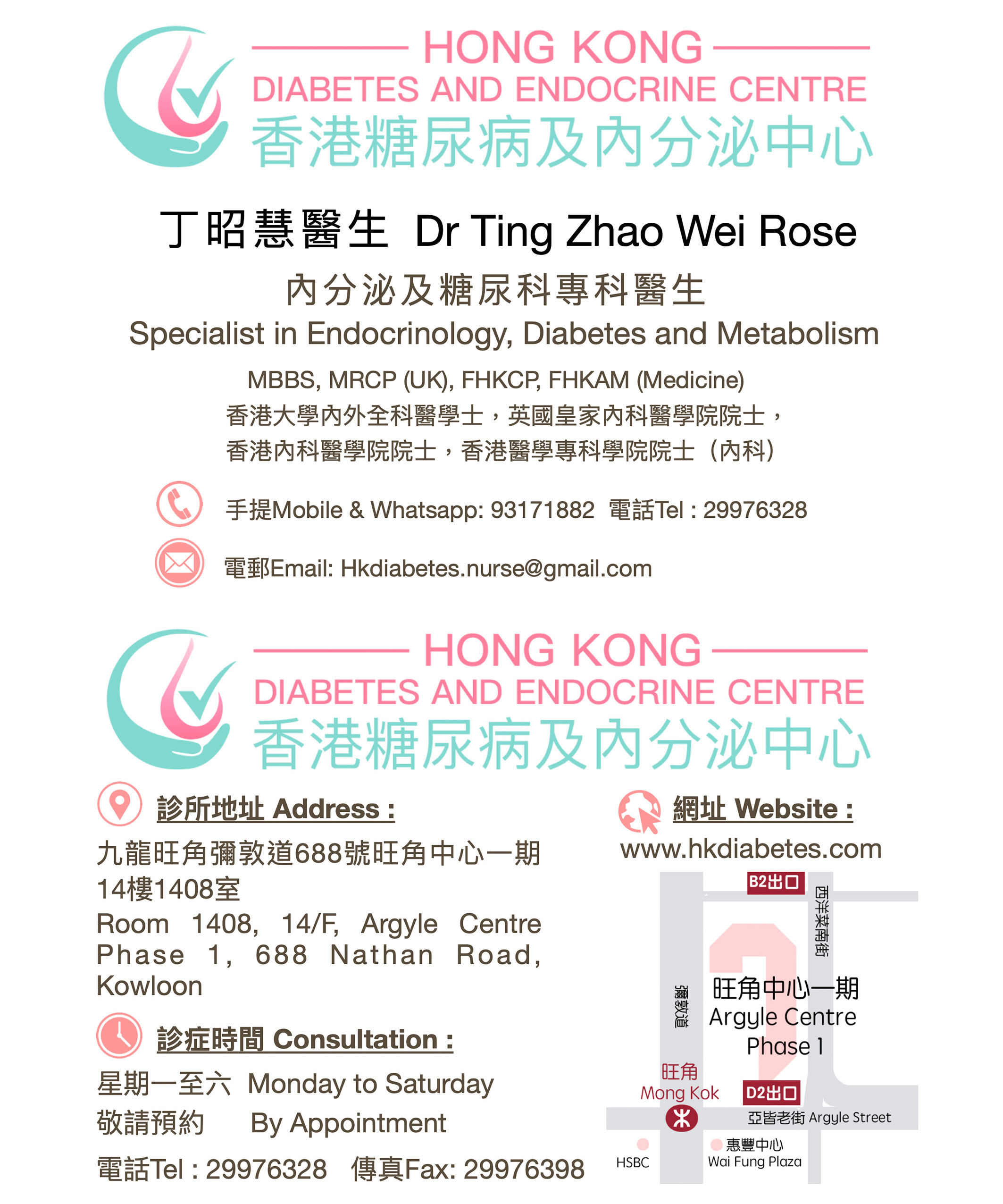 聯絡我們 Contact Us 地址: 九龍旺角彌敦道688號旺角中心一期14樓1408室 電話:29976328 Whatsapp: 93171882 電郵: hkdiabetes.nurse@gmail.com