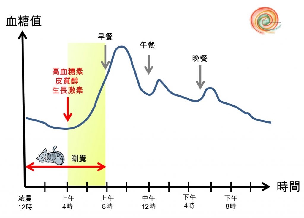 原來這個就是「黎明效應」Dawn phenomenon:晚上我們吃過晚餐後,食物消化吸收,血糖會在凌晨時分會慢慢下降。但是人的生理時鐘會在清晨(黎明時分「叫醒」身體準備白天工作,因而分泌皮質醇、生長激素這些會令血糖升高的荷爾蒙,這個現象在糖尿病人尤其明顯,從而引起血糖過高。
