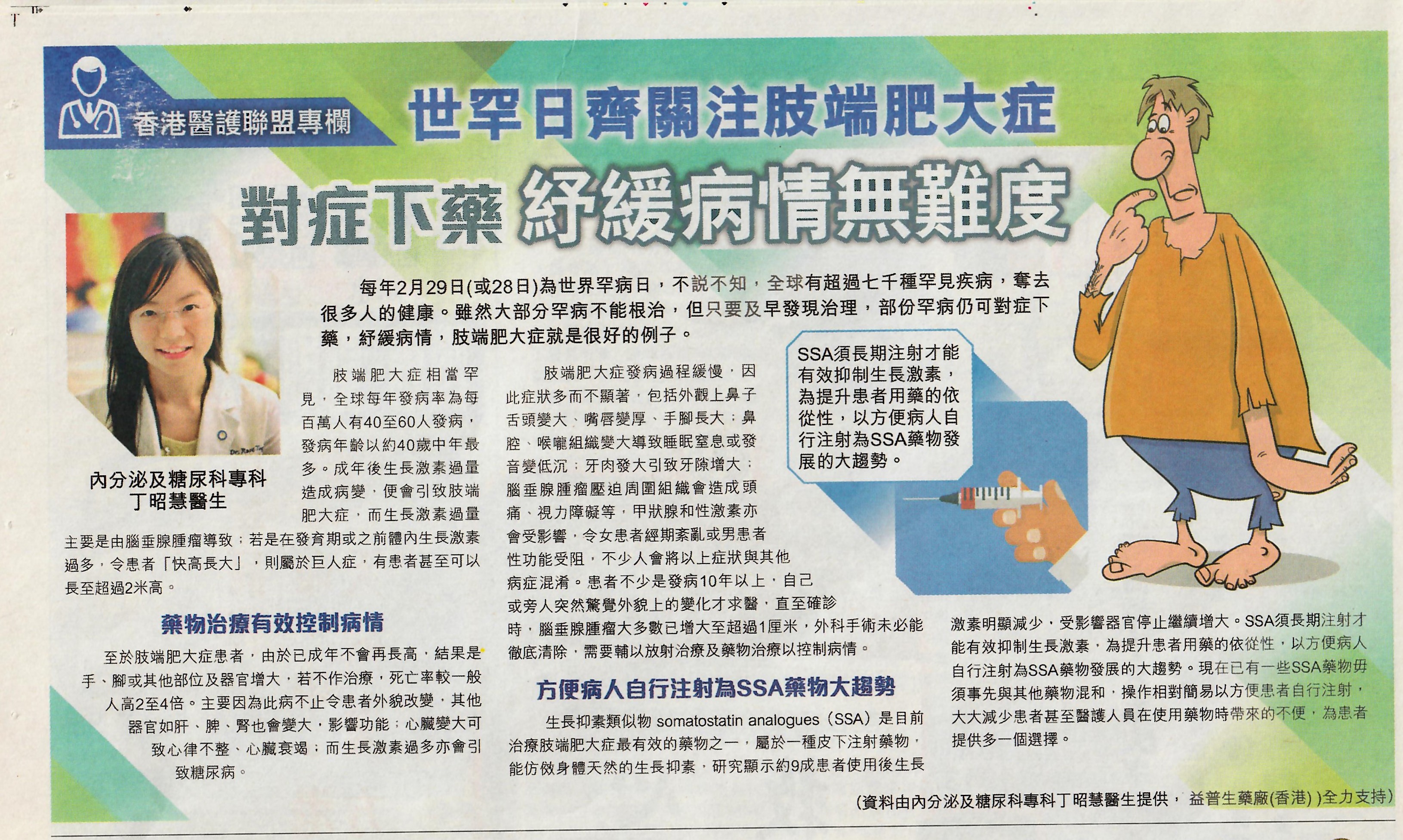 Read More每年2月29日(或28日)為世界罕病日,不說不知,全球有超過七千種罕見疾病,奪去很多人的健康。雖然大部分罕病不能根治,但只要及早發現治理,部份罕病仍可對症下藥,舒緩病情,肢端肥大症就是很好的例子。 肢端肥大症相當罕見,全球每年發病率為每百萬人有40至60人發病,發病年齡以約40歲中年最多。成年後生長激素過量造成病變,便會引致肢端肥大症,而生長激素過量主要是由腦垂腺腫瘤導致;若是在發育期或之前體內生長激素過多,令患者「快高長大」,則屬於巨人症,有患者甚至可以長至超過2米高。 藥物治療有效控制病情 至於肢端肥大症患者,由於已成年不會再長高,結果是手、腳或其他部位及器官增大,若不作治療,死亡率較一般人高2至4倍。主要因為此病不止令患者外貌改變,其他器官如肝、脾、腎也會變大,影響功能;心臟變大可致心律不整、心臟衰竭;而生長激素過多亦會引致糖尿病。 肢端肥大症發病過程緩慢,因此症狀多而不顯著,包括外觀上鼻子舌頭變大、嘴唇變厚、手腳長大;鼻腔、喉嚨組織變大導致睡眠窒息或發音變低沉;牙肉發大引致牙隙增大;腦垂腺腫瘤壓迫周圍組織會造成頭痛、視力障礙等,甲狀腺和性激素亦會受影響,令女患者經期紊亂或男患者性功能受阻,不少人會將以上症狀與其他病症混淆。患者不少是發病10年以上,自己或旁人突然驚覺外貌上的變化才求醫,直至確診時,腦垂腺腫瘤大多數已增大至超過1厘米,外科手術未必能徹底清除,需要輔以放射治療及藥物治療以控制病情。 方便病人自行注射為SSA藥物大趨勢 生長抑素類似物 somatostatin analogues(SSA)是目前治療肢端肥大症最有效的藥物之一,屬於一種皮下注射藥物,能仿傚身體天然的生長抑素,研究顯示約9成患者使用後生長激素明顯減少,受影響器官停止繼續增大。SSA須長期注射才能有效抑制生長激素,為提升患者用藥的依從性,以方便病人自行注射為SSA藥物發展的大趨勢。現在已有一些SSA藥物毋須事先與其他藥物混和,操作相對簡易以方便患者自行注射,大大減少患者甚至醫護人員在使用藥物時帶來的不便,為患者提供多一個選擇。